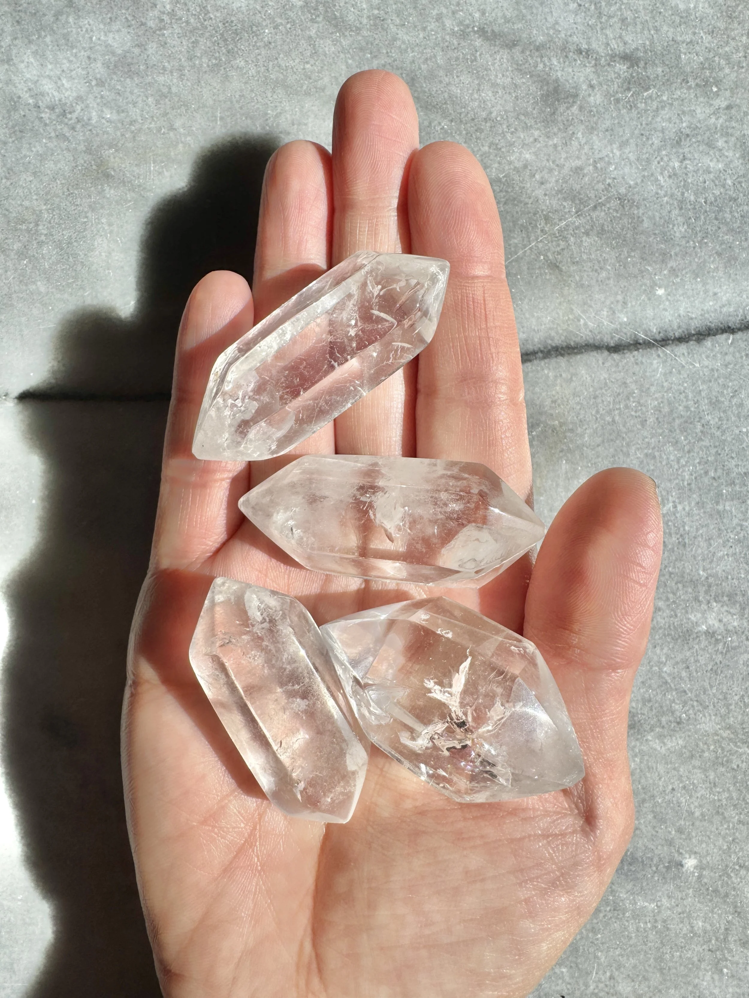These clear quartz points vary in cut and inclusion patterns from the stock photos shown. Online orders are picked at random.